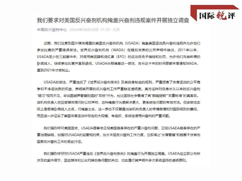 这些表态和呼声,坐实了美国体育运动中存在大规模、有组织、系统性使用兴奋剂的严重问题,也说明国际社会看清:美方为保住所谓“优势地位”贼喊捉贼,无所不用其极。