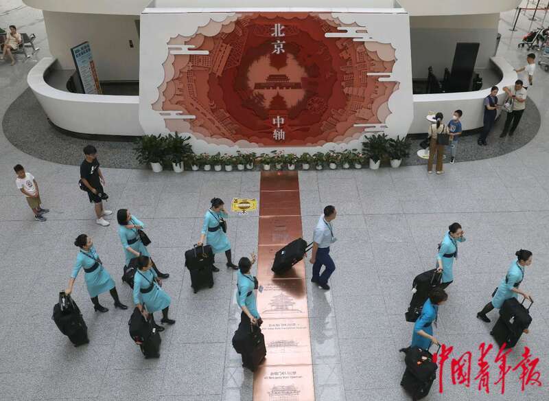 8月10日,北京大兴国际机场航站楼,一架航班的乘务人员从北京中轴线的主题背景墙前经过。中青报·中青网记者 陈剑/摄