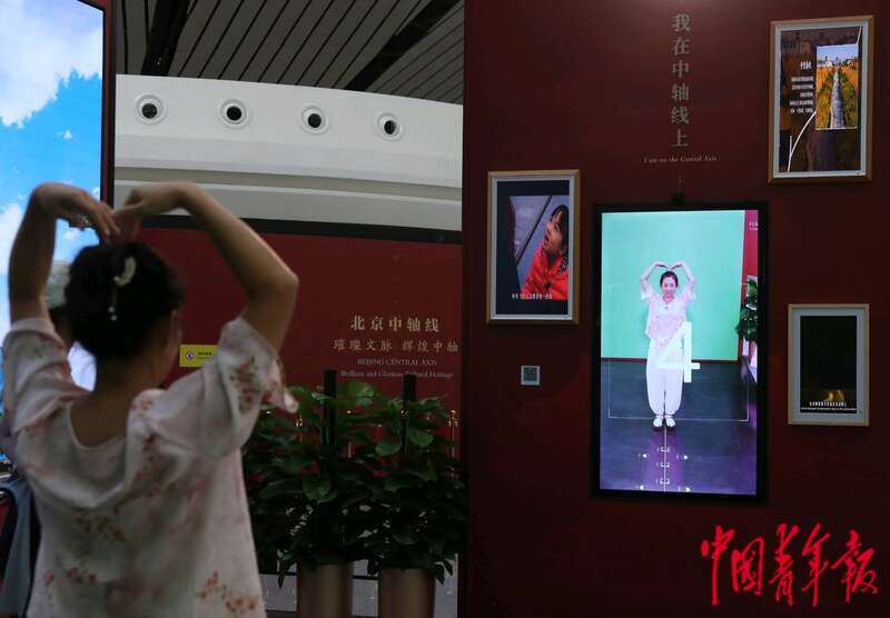8月10日,北京大兴国际机场航站楼北京中轴线主题展览展区,一位游客在拍照装置前留影。中青报·中青网记者 陈剑/摄