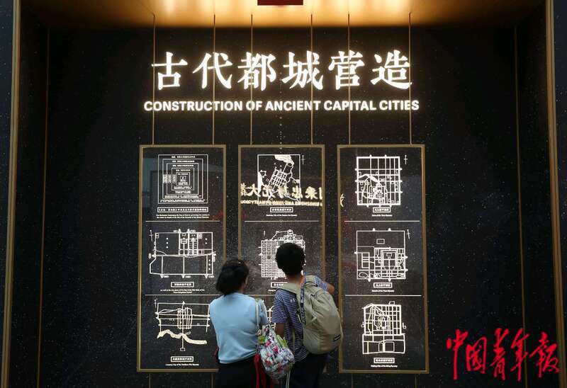 8月10日,北京大兴国际机场航站楼北京中轴线主题展览展区,旅客观看墙上的古代都城营造的投影展示。中青报·中青网记者 陈剑/摄