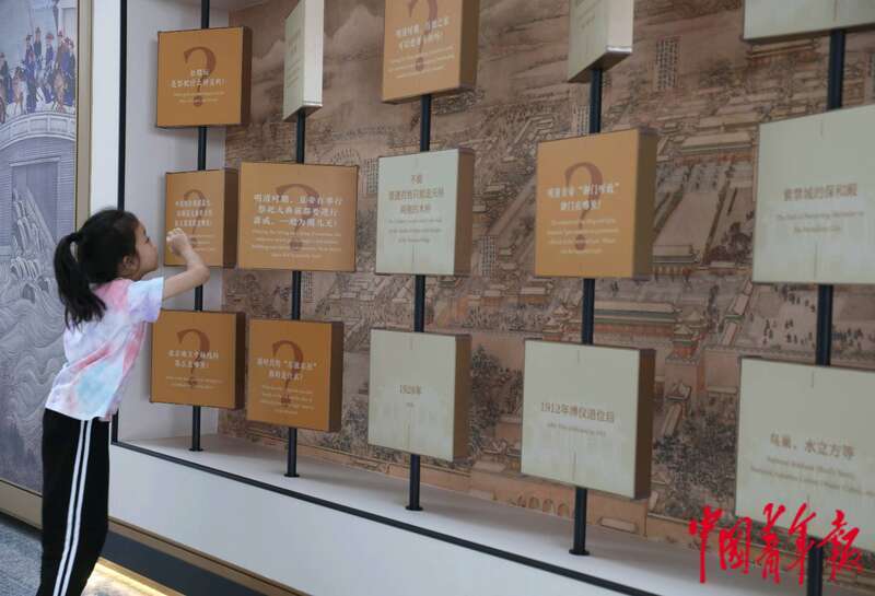 8月10日,北京大兴国际机场航站楼北京中轴线主题展览展区,一位小旅客翻看游戏问答的牌子。中青报·中青网记者 陈剑/摄