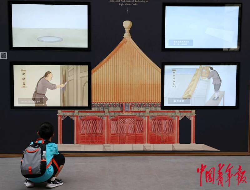 8月10日,北京大兴国际机场航站楼北京中轴线主题展览展区,一位小旅客蹲在地上观看墙上的传统建筑工艺八大作的投影展示。中青报·中青网记者 陈剑/摄
