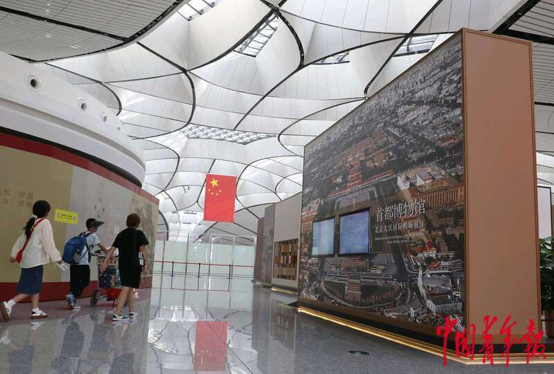 8月10日,北京大兴国际机场航站楼,旅客利用候机间隙,在北京中轴线主题展览展区参观。本次展览由北京大兴国际机场和首都博物馆联合举办,展览为期一年,每天8时至20时对过往的游客开放。中青报·中青网记者 陈剑/摄