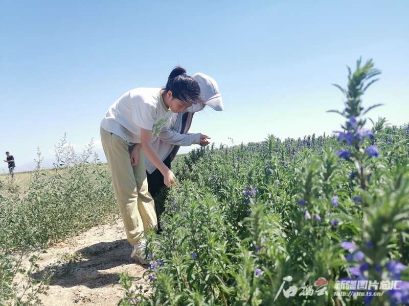 8月9日,在乌鲁木齐南山脚下,路过的游客在新疆一中药民族药企业的道地药材种植基地欣赏香青兰花。石榴云/新疆日报记者 赵悦摄