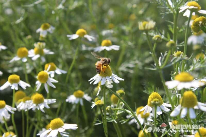 8月9日,在天山天池脚下的阜康市,新疆绿之康农业科技有限公司3500亩药材种植基地绿意盎然。薄荷、一枝蒿散发着独特清香,小蜜蜂在洋甘菊花丛中嗡嗡地飞来飞去。