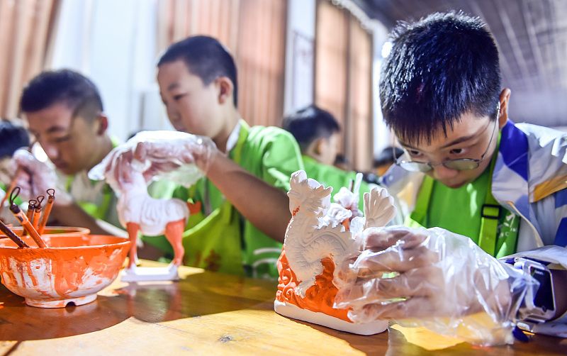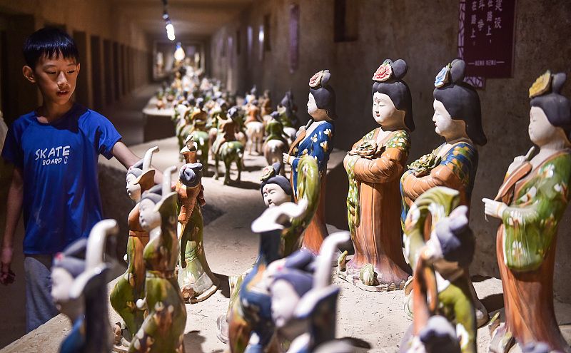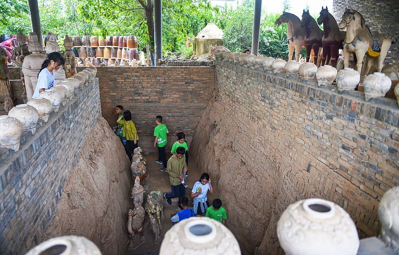 2024年8月10日,小朋友们在河南洛阳市孟津区朝阳镇南石山村唐三彩文化园欣赏仿古唐三彩作品。
