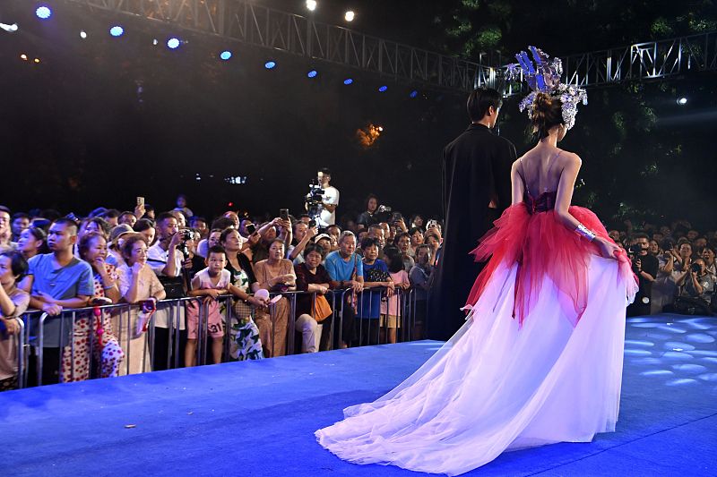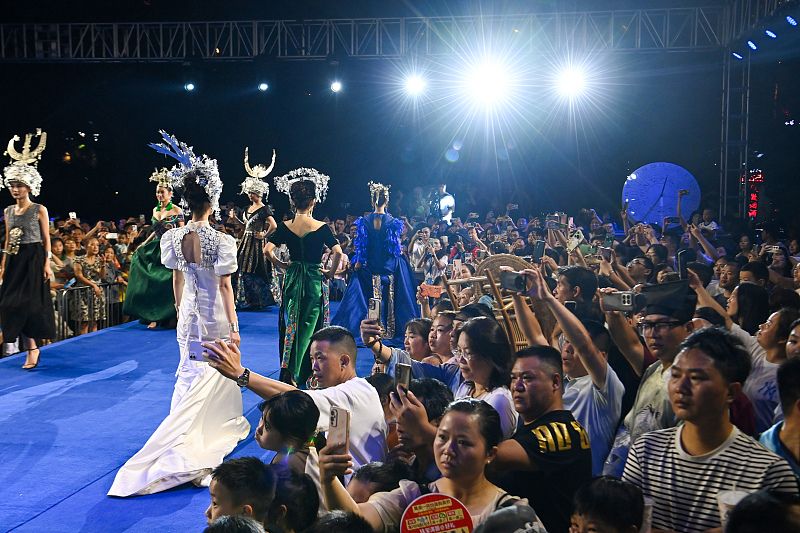 2024年8月10日,贵阳,云岩区文昌阁路边音乐会黔东南村T对对碰专场,穿着苗绣航天服的男青年在走秀。