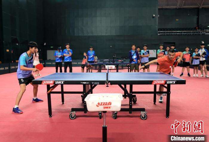 中新社成都8月12日电 (王利文 汪思维)12日在中国国家队出征巴黎奥运会前备训的成都市全国重点乒乓球运动学校训练馆内,小小的乒乓球在球桌上飞速旋转、往来穿梭,场内呼喊声和掌声此起彼伏。成都、香港、澳门的青少年轮番上阵,向原中国男子乒乓球运动员朱霖峰发起挑战。