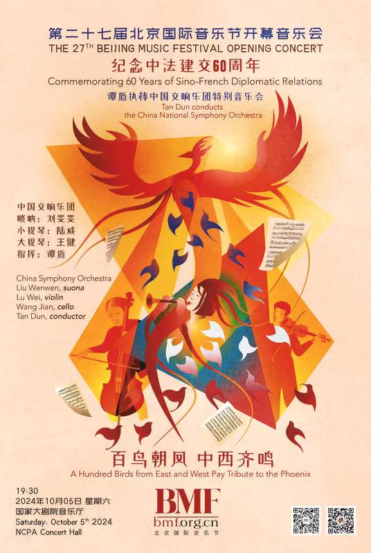 开幕式音乐会以“百鸟朝凤 中西齐鸣”为主题,将于10月5日在国家大剧院举行。演出由著名作曲家谭盾执棒中国交响乐团,携手唢呐独奏家刘雯雯、小提琴家陆威、大提琴家王健,共同奏响中国传统音乐经典名作《百鸟朝凤》、斯特拉文斯基《火鸟》组曲、谭盾《风与鸟的蜜语》、拉威尔《波莱罗舞曲》等音乐作品。