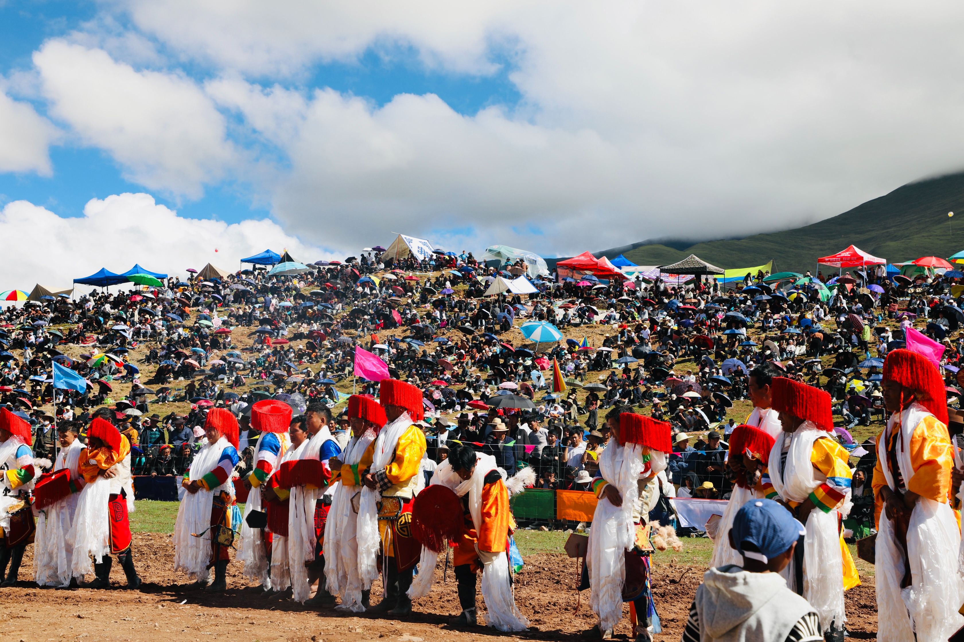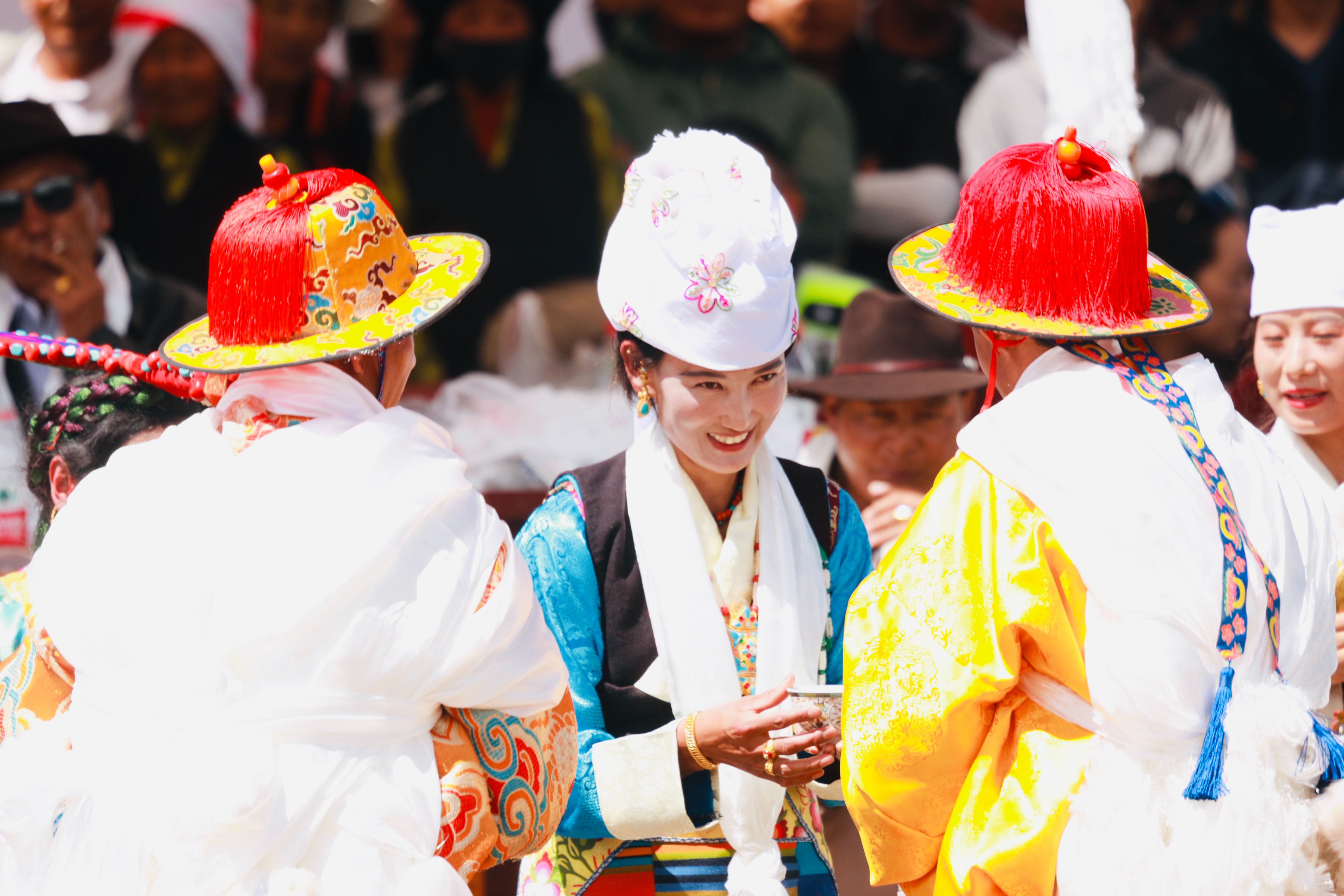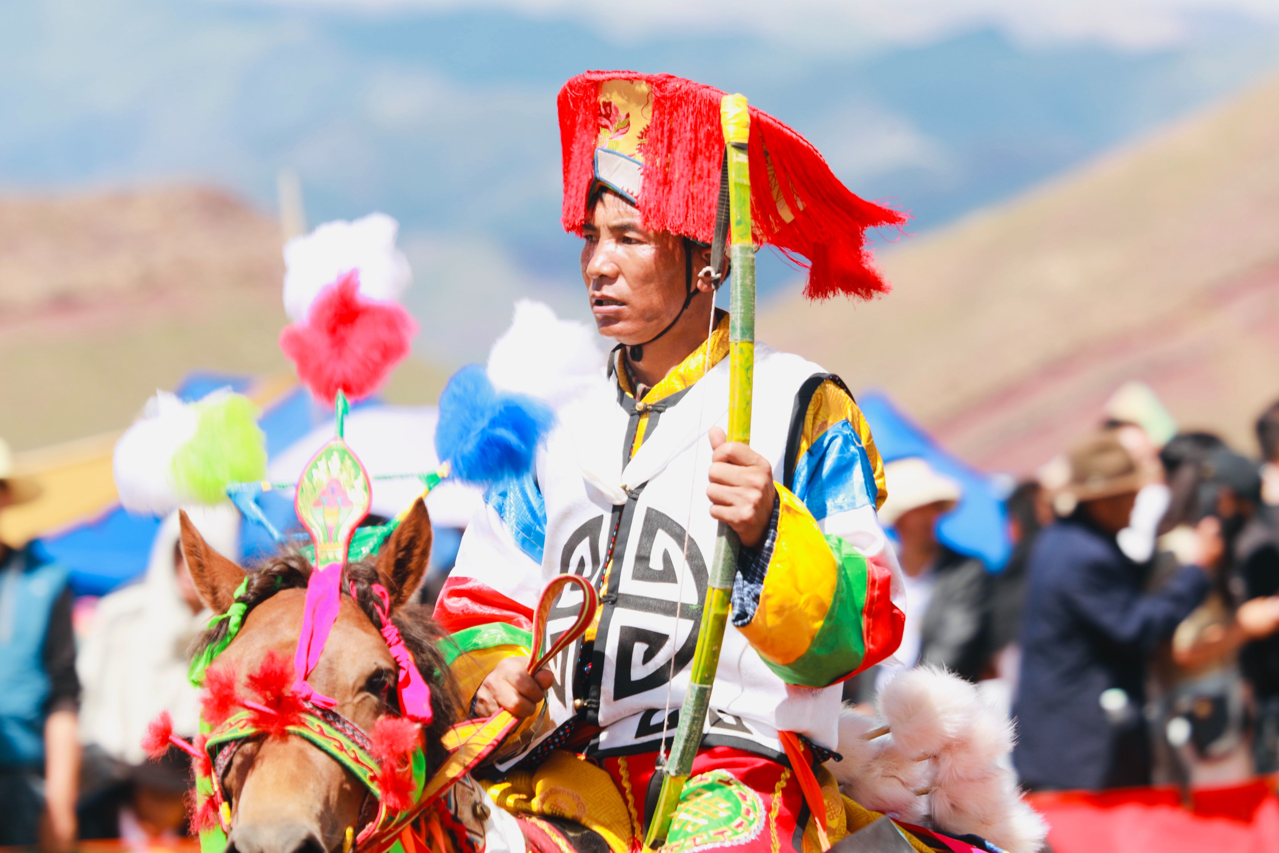 据悉,赛马是西藏各地为庆祝丰收举行“望果节”(赛马节)时的传统庆典活动,是群众最为喜爱、流传最广的体育运动之一。图为冲许嘛(藏语意为“敬酒者”)为骑手唱歌、敬酒、敬茶。