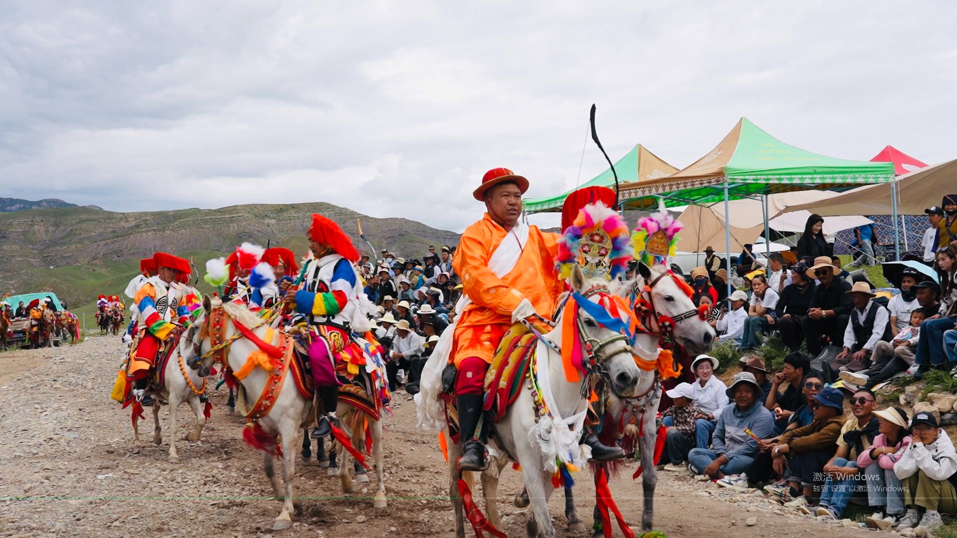 在林周县边交林乡当杰村“望果节”活动现场,随着激昂的《运动员进行曲》,当杰村“平措林望果节”活动拉开帷幕,38名马术运动员、38名射箭运动员在2万多名观众的欢呼声中迈入现场。图为赛马选手参加射箭比赛。