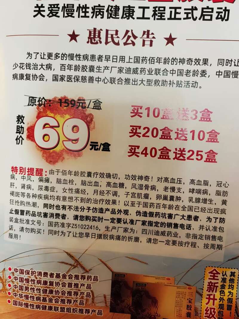 以“轰动医学界的中华第一方”所推荐的“三宝胶囊”为例。“杂志”最后一页贴出了一则“惠民公告”,其中表示原价159元每盒的药品,在多个机构发起的救助补贴活动下,救助价为69元每盒,买10盒送3盒,买20盒送10盒,买40盒送25盒。不过记者在多个渠道,以相同品牌和相同生产厂家为基础比价发现,在某平台该品牌旗舰店,单盒价格为39.6元,另一家平台的单盒价格为11元、14.4元。相比而言,通过“优惠活动”,给足的“救助”价格,卖给老人却是最贵的。
