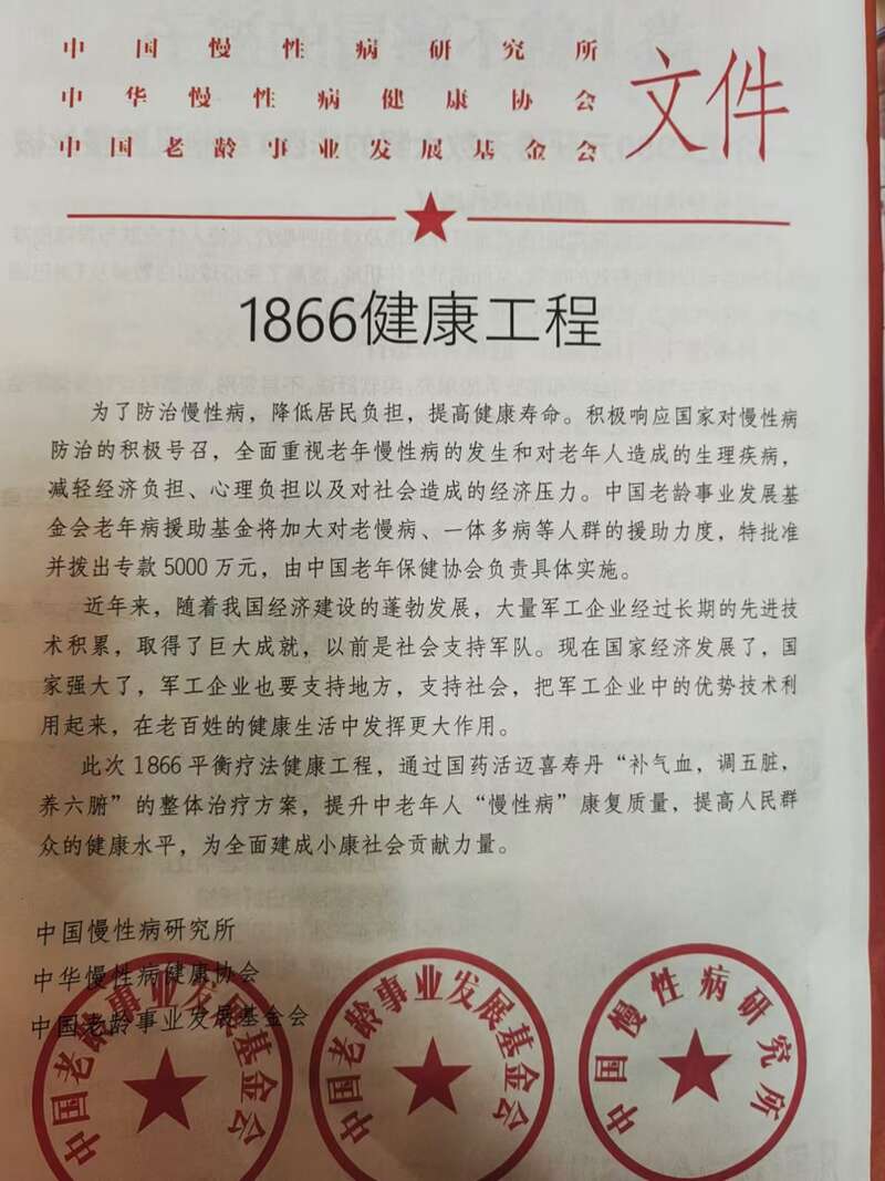 一本“杂志”封面内容为“多活三十年的奥秘”,实际是推销“人参固本丸”药物。在这本“杂志”倒数第二页,印刷有一个名为“1866健康工程”的“红头”文件,盖章署名的三家单位依次为中国慢性病研究所、中华慢性病健康协会以及中国老龄事业发展基金会。其中表明,“中国老龄事业发展基金会老年病援助基金将加大对老慢病、一体多病等人群的援助力度……”