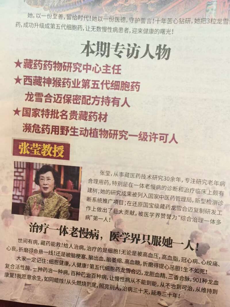为了推销一款名为“龙心提取液”的药品,一本“杂志”的封面文字为“一颗生物原子弹”“来自清华大学必读刊物”,并且把“清华大学”几个字特别标注。不过翻遍杂志,除了介绍两位清华大学教授之外,并无清华大学任何官方信息介绍。另一本杂志,第1页是一名张姓教授的专访介绍,其中张教授被介绍为“藏药药物研究中心主任”“综合治理一体多病第一人!”记者查阅该“杂志”推销的药物,发现生产方为西藏某药业。一名工作人员回复记者说,该药品并没有请张教授介绍或者推销,也没有听说过这名教授,更没有印刷过该“杂志”推销药品,“我怀疑是造假的,您还是多留心吧。”