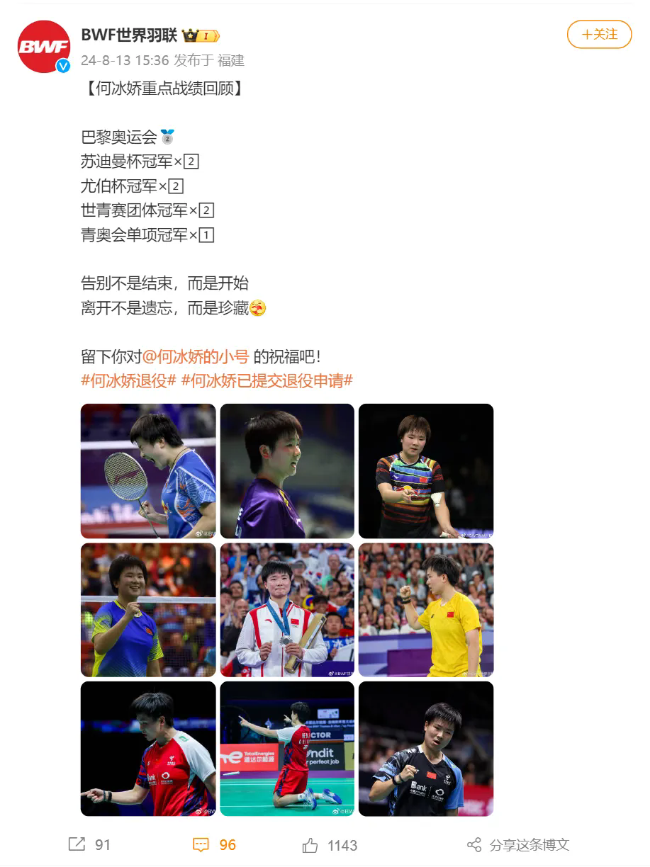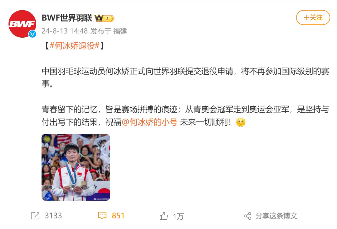 据BWF世界羽毛球联合会官方微博,中国羽毛球运动员何冰娇正式向世界羽联提交退役申请,将不再参加国际级别的赛事。