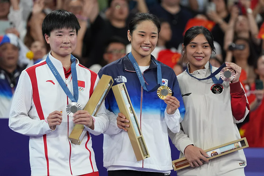 何冰娇在巴黎奥运会羽毛球女单决赛上以0 :2负于现世界排名第一的韩国选手安洗莹,为中国羽毛球队夺得一枚银牌。颁奖仪式上,何冰娇右手拿着的西班牙队队徽引人瞩目,她在赛后新闻发布会上解释说,这枚西班牙队队徽来自西班牙羽协,“我希望把西班牙选手马林的精神带到决赛赛场”。