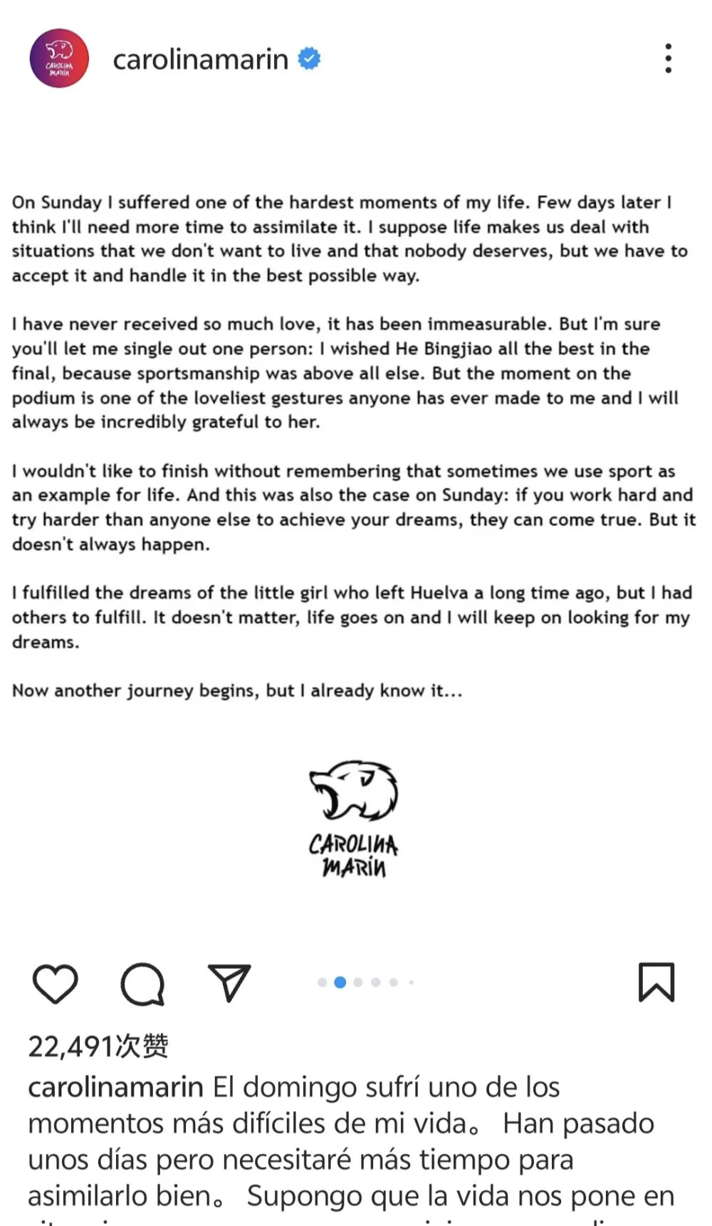 马林在社交媒体发文,感谢所有给她支持的人,并特别感谢了何冰娇。“我鼓励何冰娇在决赛中有好的发挥,因为这是高于一切的体育精神。她在领奖台上所做的事是我受到的支持中最可爱的举动之一,我会永远感激她。”