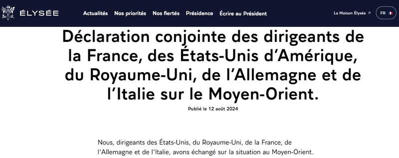 法国总统府爱丽舍宫12日发表《法美英德意领导人关于中东问题的联合声明》。声明说,五国领导人讨论了中东局势,全力支持为缓和紧张局势、实现停火和释放被扣押人员所作出的努力。此外,声明表达了对以色列的支持,呼吁伊朗放弃对以色列进行军事攻击的持续威胁。五国领导人讨论了如果发生此类攻击将对地区安全造成的严重后果。