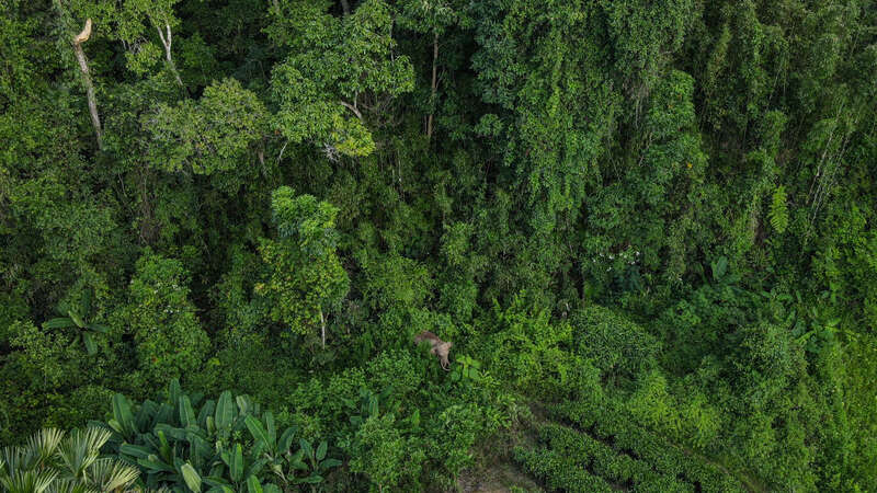 在云南西双版纳国家级自然保护区勐养片区边缘活动的亚洲象阿宝(7月26日无人机照片)。(许团明 摄)