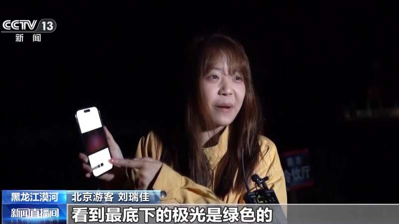 北京游客 刘瑞佳:看到最底下的极光是绿色的,然后慢慢往上就变成粉色、紫色、还有红色了,超美,非常幸运,很激动。