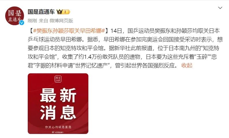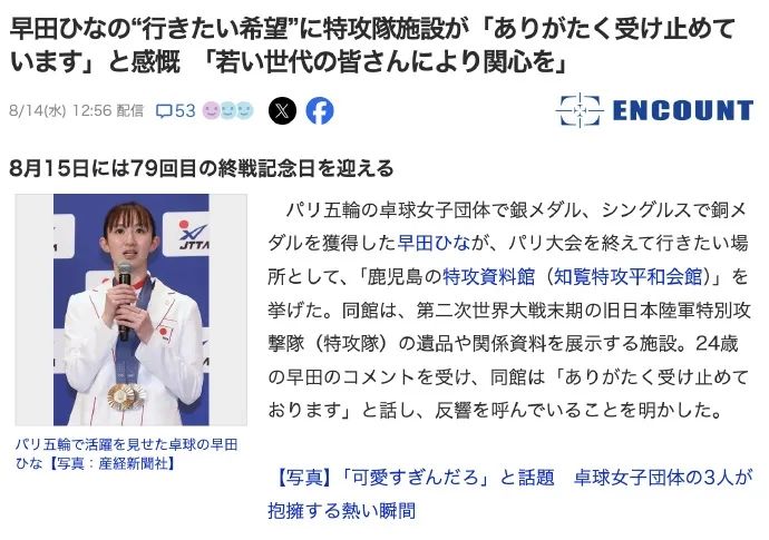据悉,早田希娜在参加完奥运会回国接受采访时表示,想要参观日本的知览特攻和平会馆。