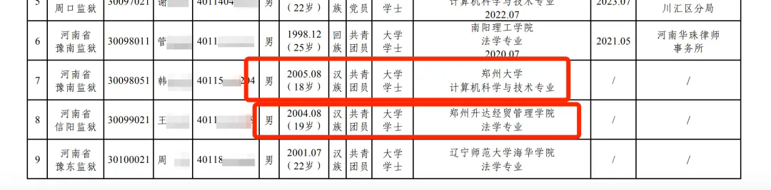 在河南省监狱管理局此前公布的《河南省监狱系统2024年度统一考试录用公务员第二批拟录取人员名单》中,出生于2005年8月的韩某某,以及出生于2004年8月的王某某引起了网友关注。