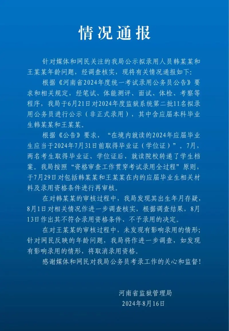 8月16日,河南省监狱管理局发布情况通报称,我局发现韩某某出生年月存疑,根据调查结果,8月13日作出其不符合录用资格条件、不予录用的决定。