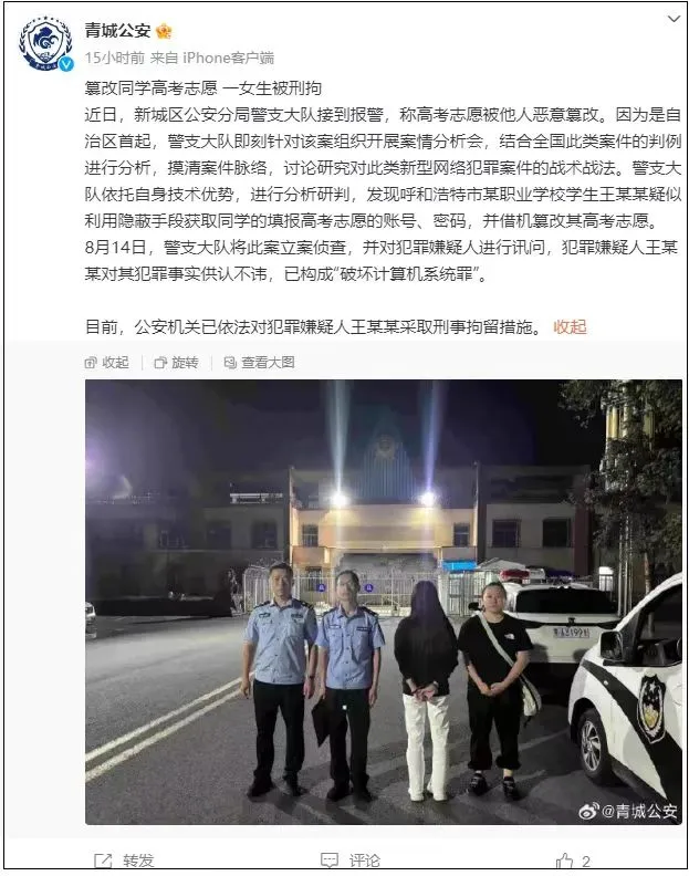 内蒙古自治区呼和浩特市公安局官方微博消息,近日,新城区公安分局警支大队接到报警,称高考志愿被他人恶意篡改。