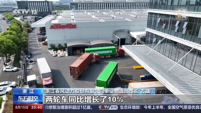 浙江春风动力股份有限公司单证物流部部长 方建:上半年我们出口四轮车同比增长了40%,两轮车同比增长了10%,然后集装箱大概出运了7700个大柜,同比增长了27%。