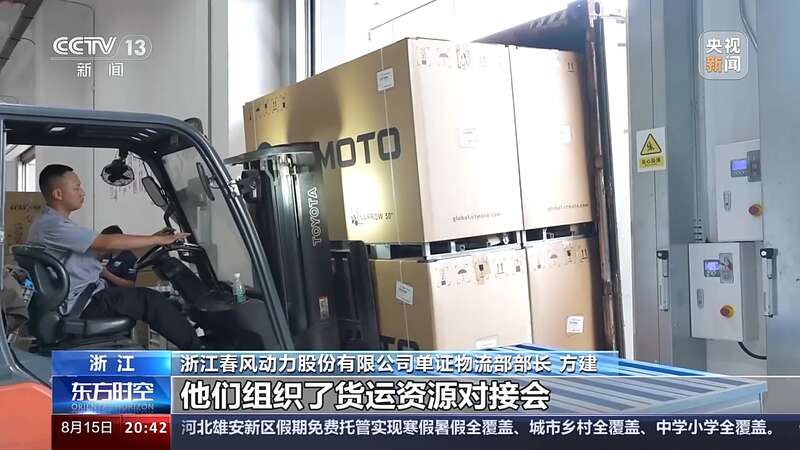 浙江春风动力股份有限公司单证物流部部长 方建:多方面去寻求这种资源的匹配,然后政府这边也积极给我们匹配一些资源。他们组织了货运资源对接会,我们在这里面也匹配了一些临时的舱位。