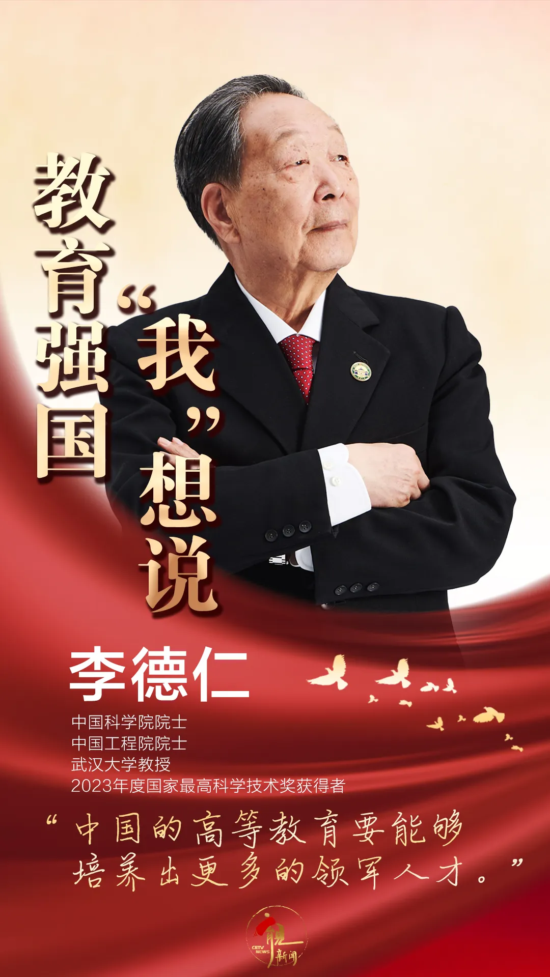 今天,“奋进在教育强国大路上——沿着总书记指引的方向砥砺前行”专栏之 “教育强国‘我’想说” 系列,来听武汉大学教授、 202 3年度国家最高科学技术奖获得者李德仁院士 的讲述——