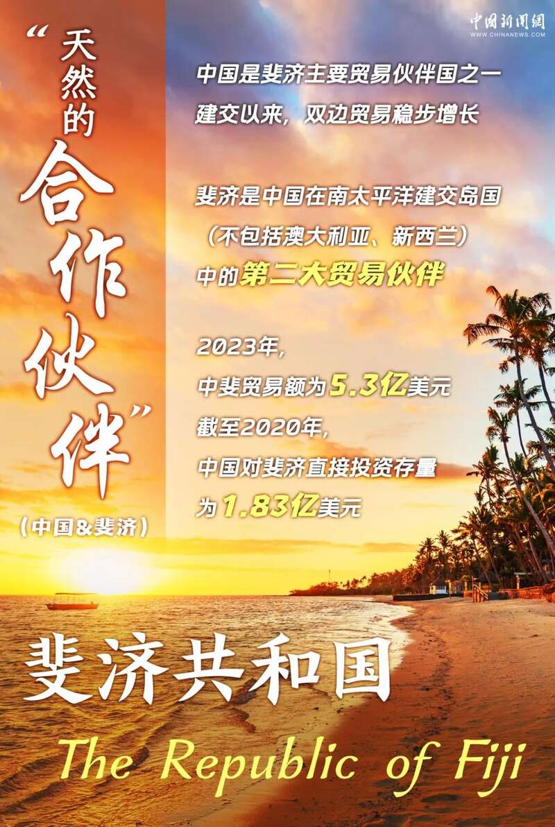 斐济是最早同中国建交的太平洋岛国。中斐建交以来,两国关系历久弥新,各领域交流合作成果丰硕。作为天然的合作伙伴、可靠的真正朋友,中斐两国携手共进,带来更多发展机遇。