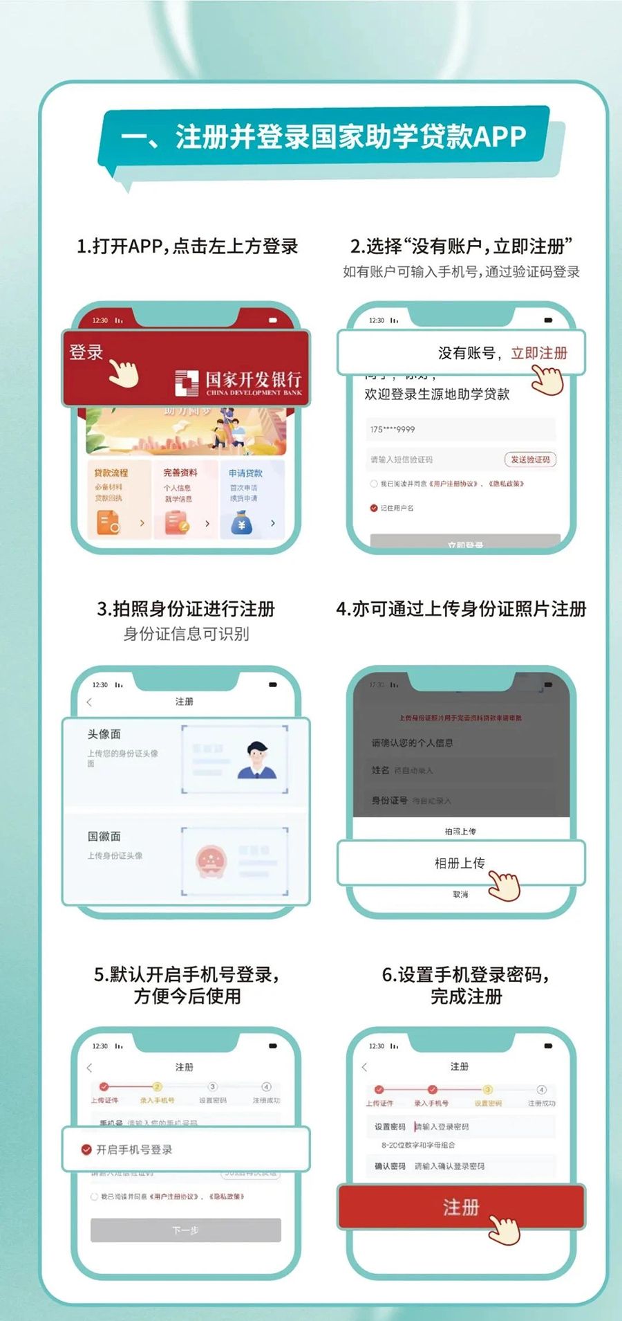 5.温馨提示:①部分地区可能会要求提供身份证正反面复印件一份,请提前向县级学生资助管理部门咨询,县级学生资助管理部门可提供申贷材料扫描上传服务;②如果借款学生及共同借款人户口不在同一本户口簿上,需携带双方户口簿原件。