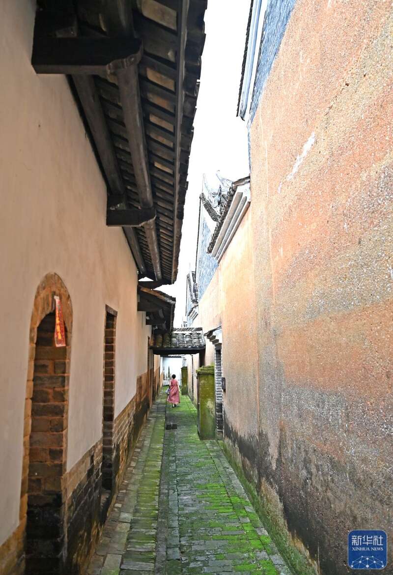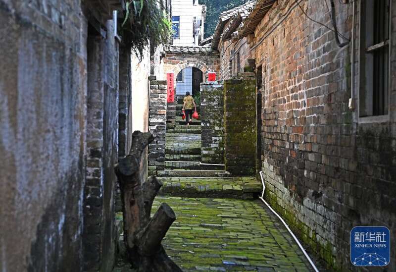 8月16日,一名村民在大芦村一条小巷里穿行。
