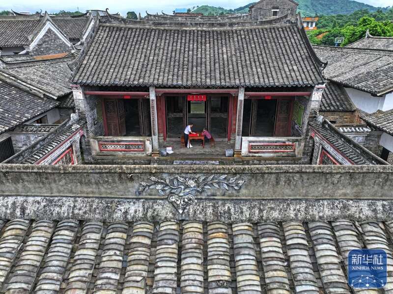 8月15日,楹联爱好者在大芦村古宅里写对联(无人机照片)。
