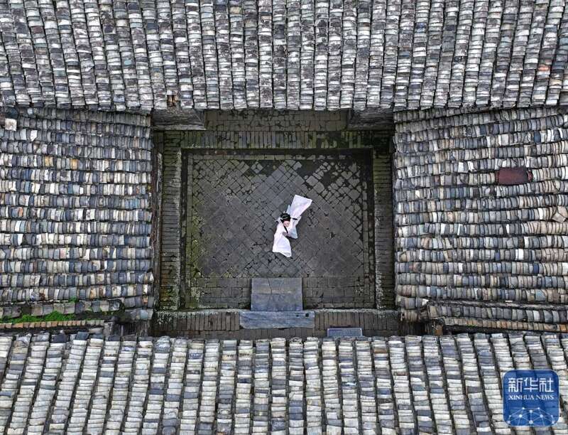 8月16日,一名身着汉服的游客在大芦村古建筑群里跳舞(无人机照片)。
