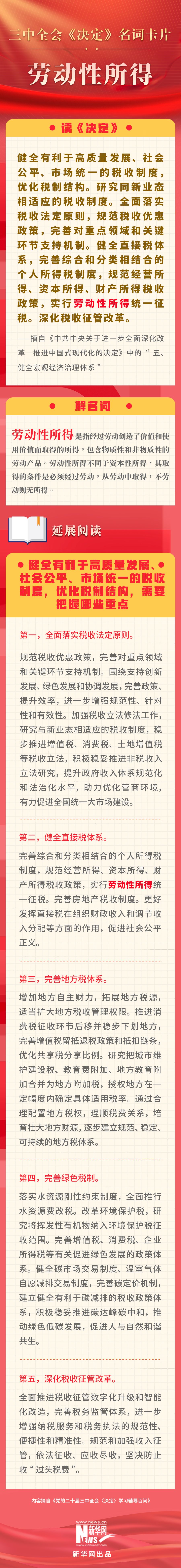 党的二十届三中全会审议通过了《中共中央关于进一步全面深化改革、推进中国式现代化的决定》。新华网依据《党的二十届三中全会〈决定〉学习辅导百问》,制作三中全会《决定》系列名词卡片,和大家一起来深入学习领会二十届三中全会精神。本期名词是“劳动性所得”。