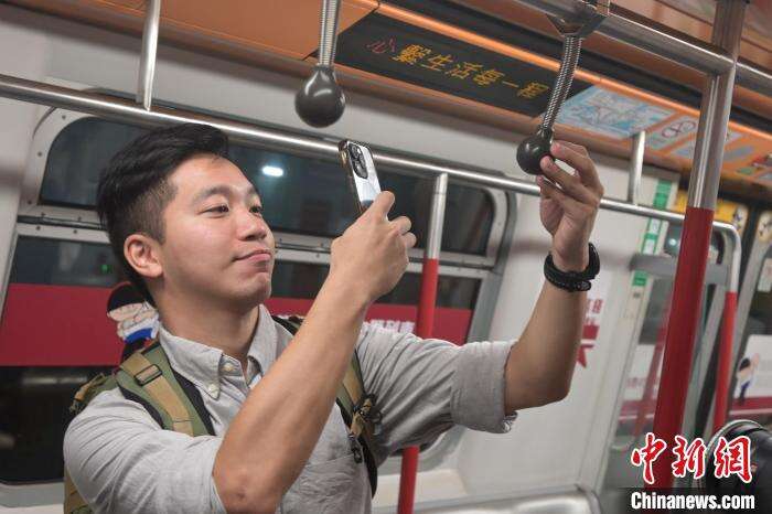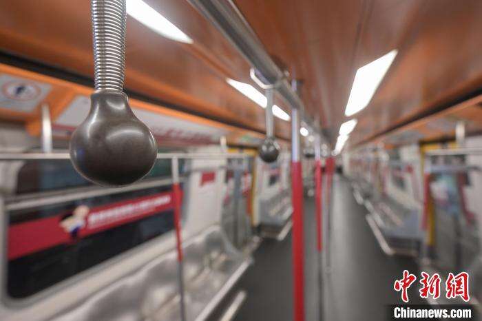 8月22日,香港铁路有限公司推出港铁四十五周年主题列车,投入市区线车队,盛载温馨的回忆点滴,服务乘客。主题列车以第一代载客列车设计为蓝本,融合“波波扶手”等经典元素,展示铁路面貌演变。图为车箱内的“波波扶手”。中新网记者 陈永诺 摄