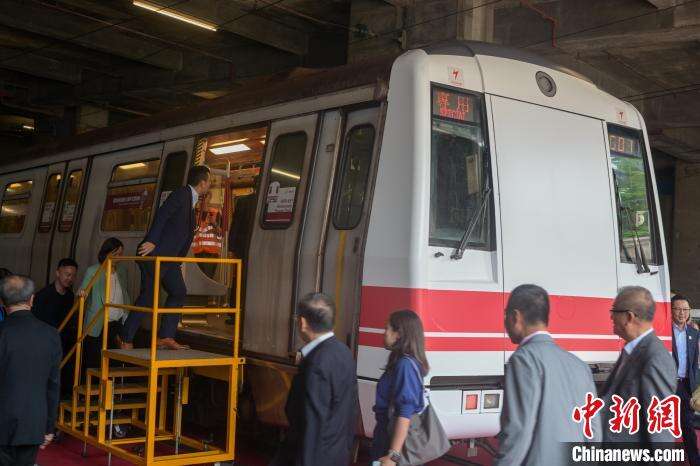 8月22日,香港铁路有限公司推出港铁四十五周年主题列车,投入市区线车队,盛载温馨的回忆点滴,服务乘客。主题列车以第一代载客列车设计为蓝本,融合“波波扶手”等经典元素,展示铁路面貌演变。图为嘉宾与主题列车合照。中新网记者 陈永诺 摄