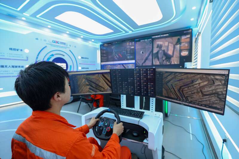 22日上午,记者在五彩湾一号露天煤矿看到,一辆辆白色无人驾驶矿卡正在矿区中精准作业,而负责“驾驶”它们的3位驾驶员则坐在距离现场几公里外的控制室内,监控数十台无人矿卡有效运行。