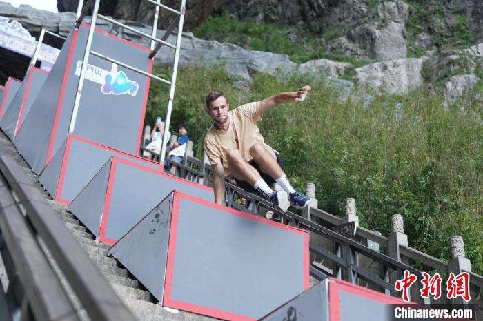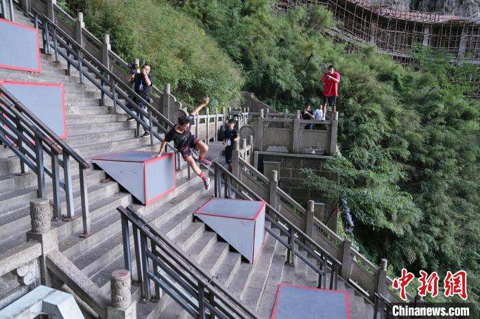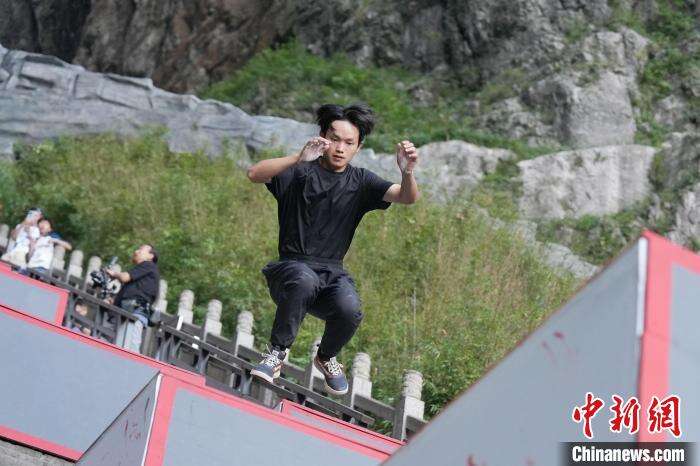 8月24日,2024天门山云纵天梯跑酷大赛在湖南张家界举行,海内外70多位跑酷选手共同挑战999级“天梯”赛道。该赛道全长近300米,垂直落差达150米,分五缓四陡,共设置108组障碍道具。图为选手参加跑酷技巧赛比赛。中新社记者 杨华峰 摄
