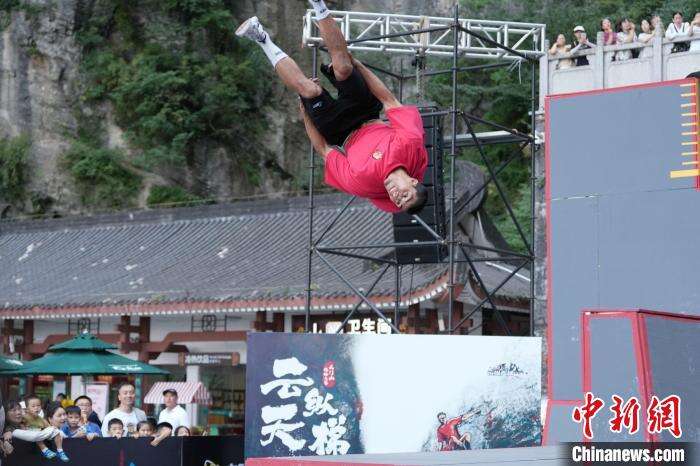 8月24日,2024天门山云纵天梯跑酷大赛在湖南张家界举行,海内外70多位跑酷选手共同挑战999级“天梯”赛道。该赛道全长近300米,垂直落差达150米,分五缓四陡,共设置108组障碍道具。图为选手在空中跳跃翻腾。中新社记者 杨华峰 摄