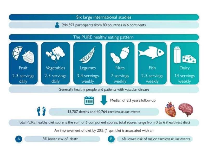 依据这6类食物,给他们的饮食评分为0-6分(6分代表饮食最健康),每个食物摄入量高于中位数时得分1分,结果发现:与最不健康的饮食相比(得分≤1),最健康的饮食(得分≥5)的人,总体死亡风险降低30%,患心血管疾病风险降低18%,心肌梗死风险降低14%,中风风险降低19%。可以说,吃够这6类食物,则不仅延寿,而且心血管更为健康。