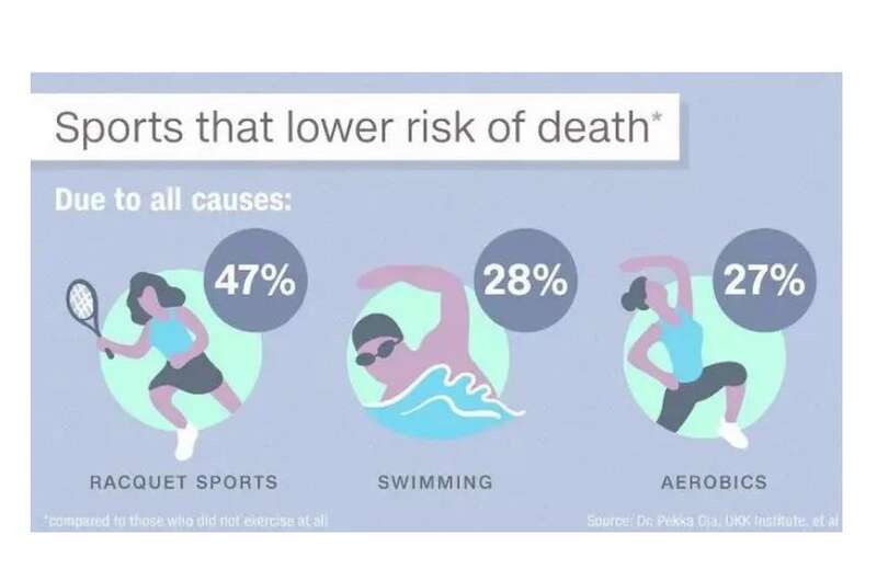 第1名:挥拍类运动(羽毛球、乒乓球、网球等),降低全因死亡率47%;