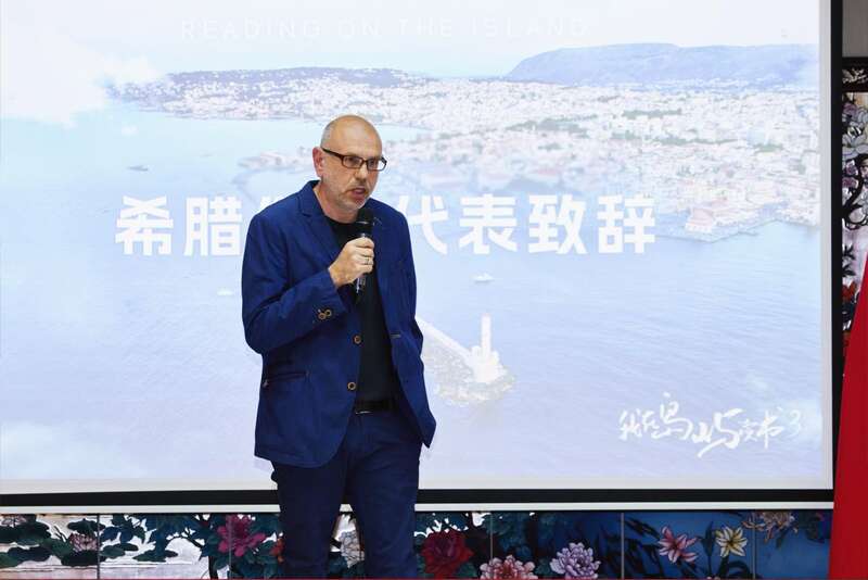 季米特里斯·莱亚科斯作为希腊作家代表致辞,欢迎远道而来的中国作家们。他说,中文和希腊语历史悠久,蕴含着丰富的文化内涵,很多文学作品中都有相通的共鸣,他期待和优秀的作家们畅聊中希文学。