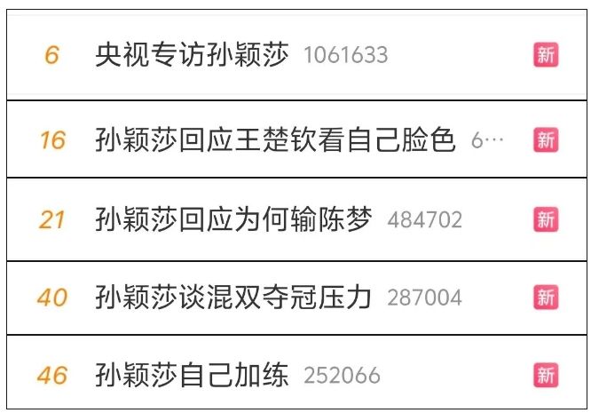 随后,#孙颖莎回应王楚钦看自己脸色#、#孙颖莎回应为何输陈梦#等多个话题冲上热搜。