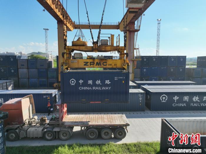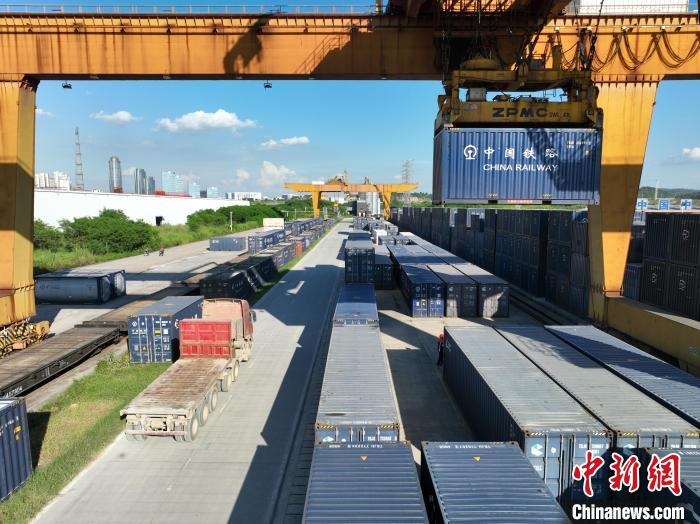 8月26日,广西南宁国际铁路港内,铁路职工顶着下午的烈日,正在为发往越南的货运班列装卸货物。该铁路港是广西始发中越班列的核心场站。国铁南宁局提供的信息显示,今年前7个月,广西始发中越班列累计发运货物6850标箱,同比增长16倍;其中7月份发运1922标箱,超过今年一季度发运量总和,为今年以来第三次刷新单月发运量纪录。图为集装箱摆满场站,等待装车。王以照 摄
