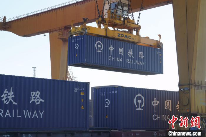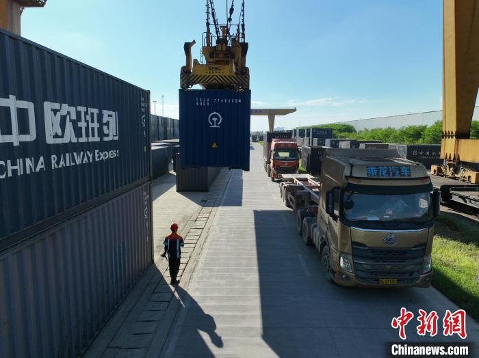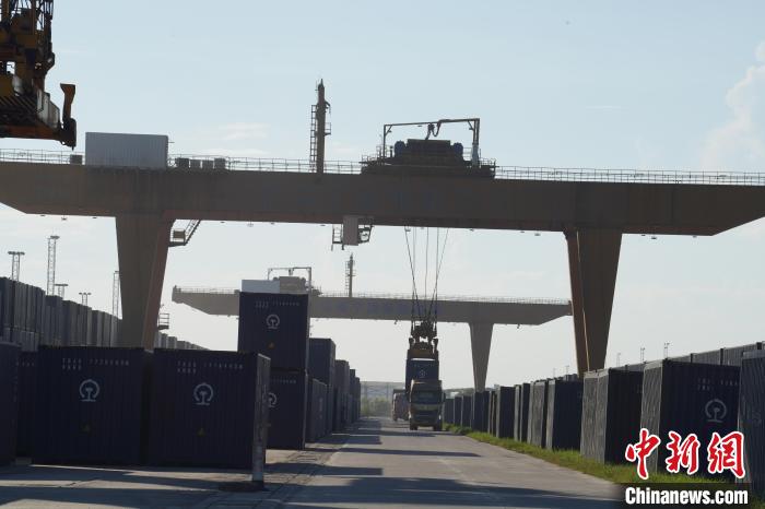 图为龙门吊正将集装箱从卡车转移至中越班列。王以照 摄