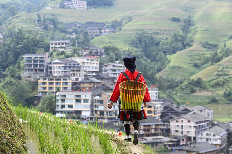 位于龙脊梯田核心地带的大寨村,地处海拔800米至1000米之间。乘坐观光缆车从山脚一路向上,20多分钟车程中,目之所及皆是翠绿稻田,整个村子被包裹在梯田之中,景色蔚为壮观。如今这里是世界各地游客的热门打卡地,也是摄影爱好者的“天堂”。