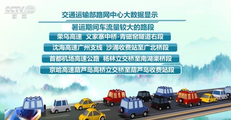 交通运输部路网中心大数据显示,暑运期间车流量较大的路段有:荣乌高速义家寨中桥-青磁窑隧道右段;沈海高速广州支线,沙涌收费站至广北桥段;首都机场高速公路,杨林立交桥至南湖渠桥段;京哈高速葫芦岛高桥立交桥至葫芦岛收费站段;京沪高速,坝头中桥至苏家湾中桥段。